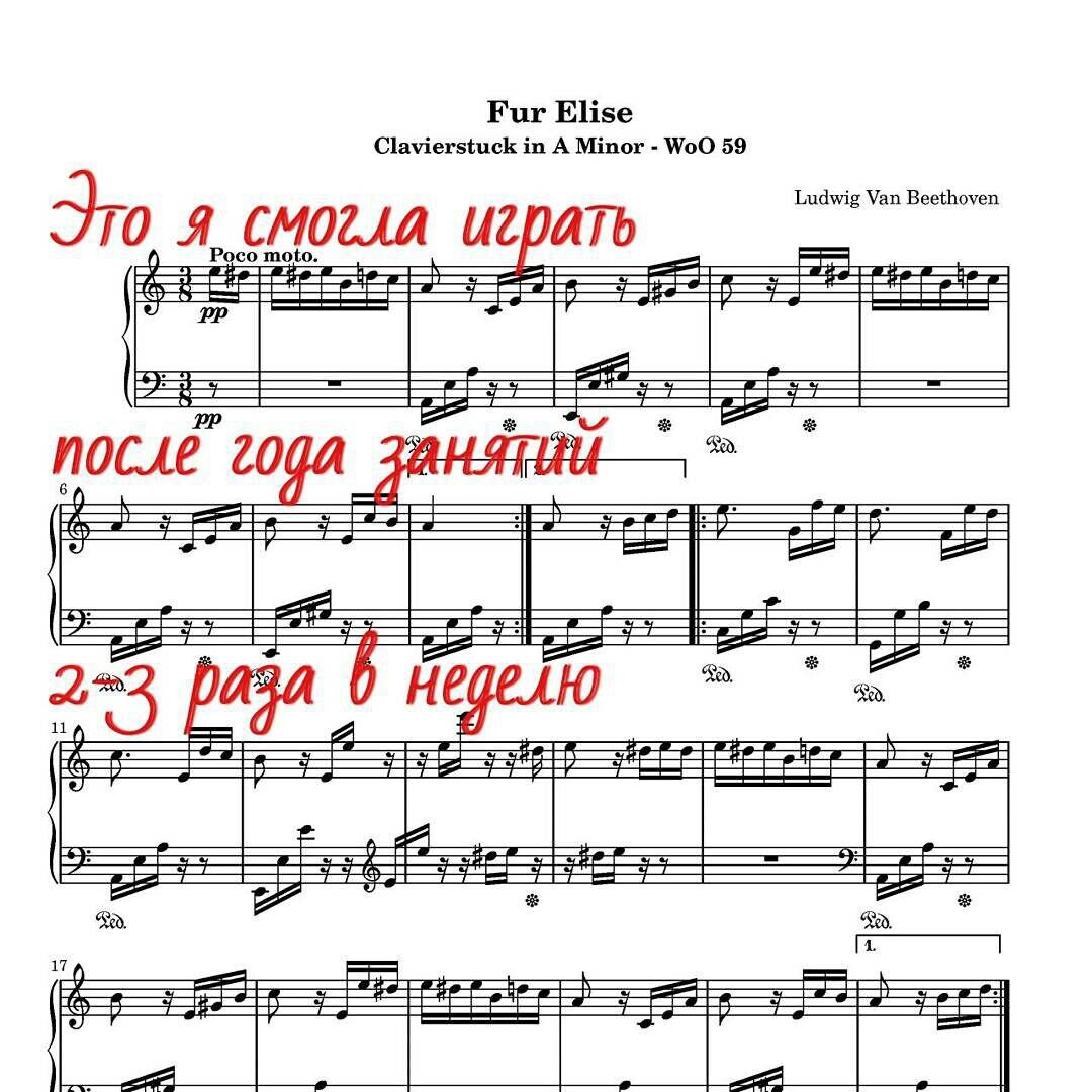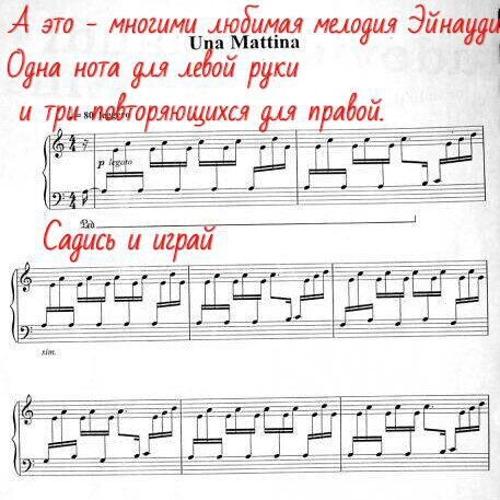 Чтобы не быть голословной я приведу пример нот вальса Шопена, известной «К Элизе» Бетховена, которая уже считается учебной, ее изучают в первые годы учебы в музыкальной школе, и любимая многими Una Mattina Эйнауди. Даже не сведущему в музыке человеку очевидна разница. Одна повторяющаяся нота для левой руки и три для правой. Вы можете это играть, а не просто слушать. И сделать красивую мелодию из четырех повторяющихся нот – большой талант.